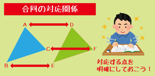 「合同条件→対応する角が等しい」のパターンを体に覚えさせておきましょう。