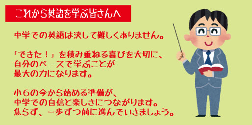 逆にいうと、小6の段階でこれらの基礎を少しだけ準備しておくだけで、中学校英語のスタートは驚くほどスムーズになります。