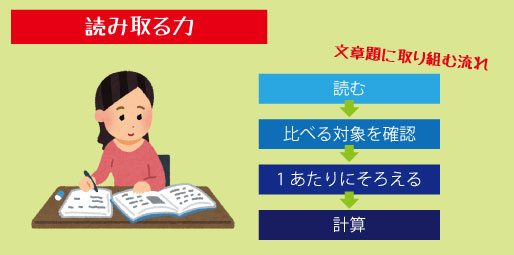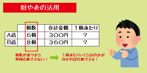 たとえば、「どちらが安いですか」と書かれていても、実際に比べるべきなのは合計金額ではなく、「1個あたりの値段」であることが多くあります。この判断ができないと、正しい計算をしていても答えがずれてしまうのです。