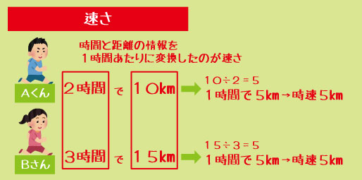 - Aさん:10km ÷ 2時間 = 5km/時間