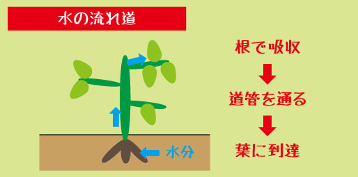水は、根から吸収され、道管を通って葉まで運ばれます。