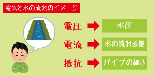 電気の流れを理解するためによく使われる方法が、「水の流れ」に例える考え方です。