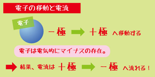 - 電子は「-極から+極へ」移動しますが、