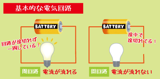 例えば、電池・導線・電球をつないで一つの輪になるように回路を作ると、電流が流れて電球が光ります。しかし、途中で導線を外して回路が途切れると、電流は流れなくなり電球も消えてしまいます。